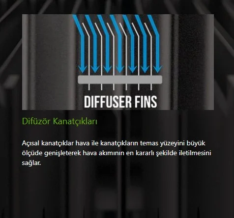 Fan kuyruğundaki kanat ucu hava akımını bir araya getirerek soğutma sistemine maksimum hava akışını toplar. Kanat sırtlarına kazınmış pençe izleri hava akışını daha da yumuşatır ve havayı ısı emiciye sabit bir şekilde yönlendirir.