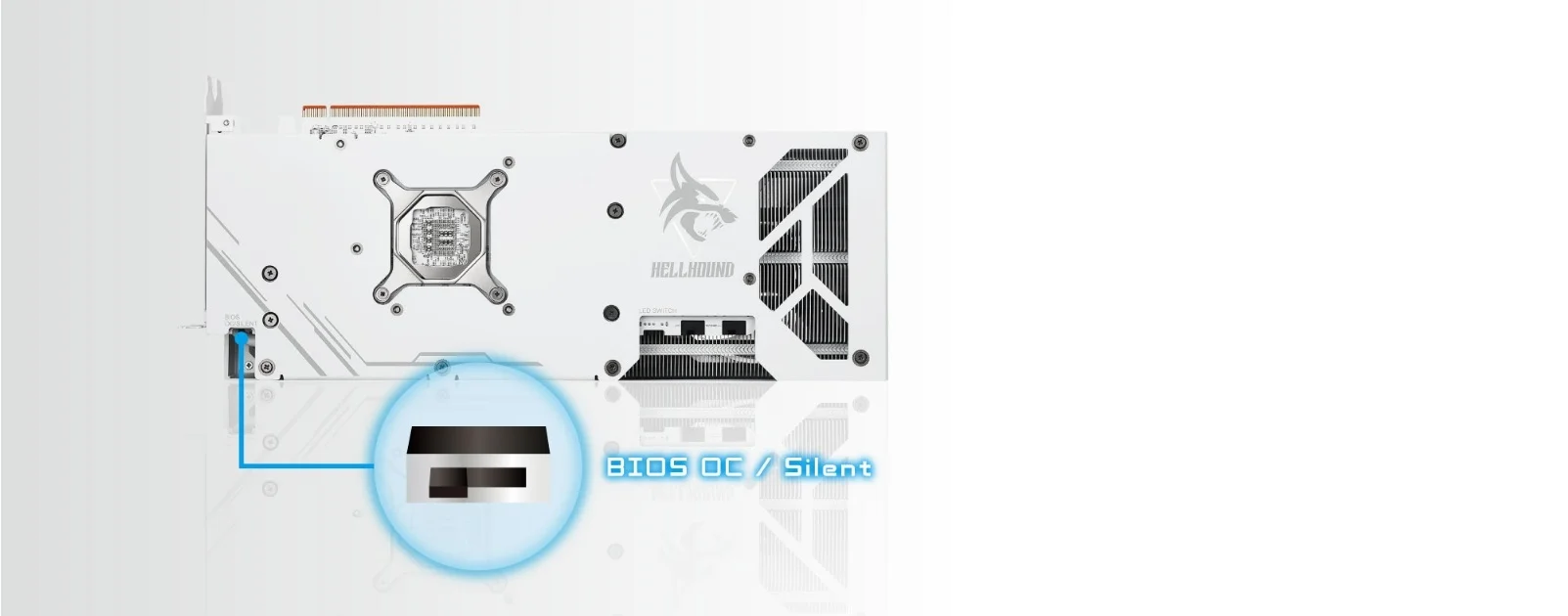 Hellhound RX 7800 XT, yerleşik Çift BIOS'a ve kolay değiştirme için bir anahtara sahiptir.-OC BIOS: Daha yüksek performans sağlamak amacıyla kartınızın daha düşük bir sıcaklıkta çalışmasını sağlamak için fan RPM'sini artıran güçlendirilmiş bir mod.