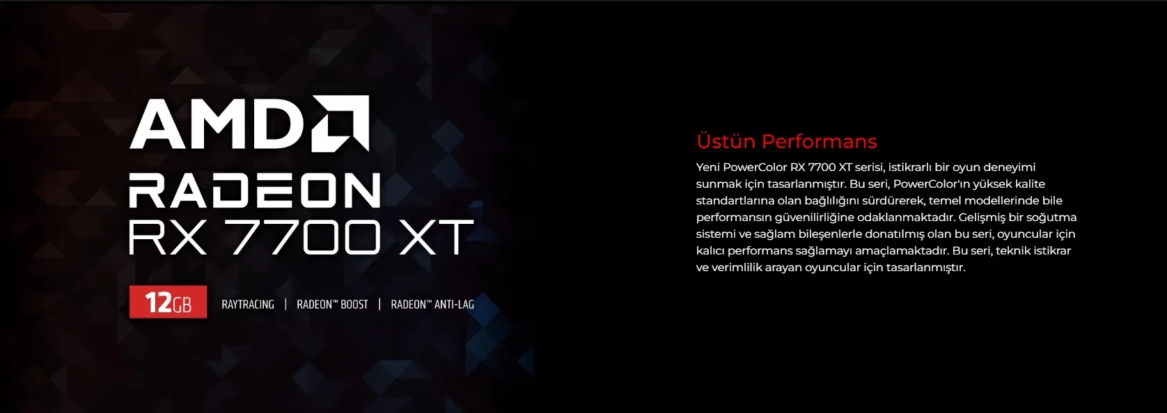 Yeni PowerColor RX 7700 XT serisi, istikrarlı bir oyun deneyimi sunmak için tasarlanmıştır. Bu seri, PowerColor'ın yüksek kalite standartlarına olan bağlılığını sürdürerek, temel modellerinde bile performansın güvenilirliğine odaklanmaktadır. Gelişmiş bir soğutma sistemi ve sağlam bileşenlerle donatılmış olan bu seri, oyuncular için kalıcı performans sağlamayı amaçlamaktadır. Bu seri, teknik istikrar ve verimlilik arayan oyuncular için tasarlanmıştır.